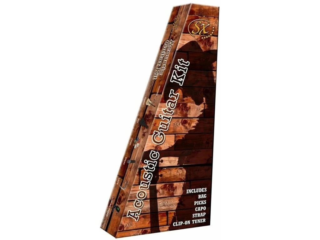 Akustická kytara ze série SX SD104K je vhodná pro začínající hráče a je nabízená v setu, který obsahuje ladičku, pouzdro, popruh, kapodastr a trsátka.