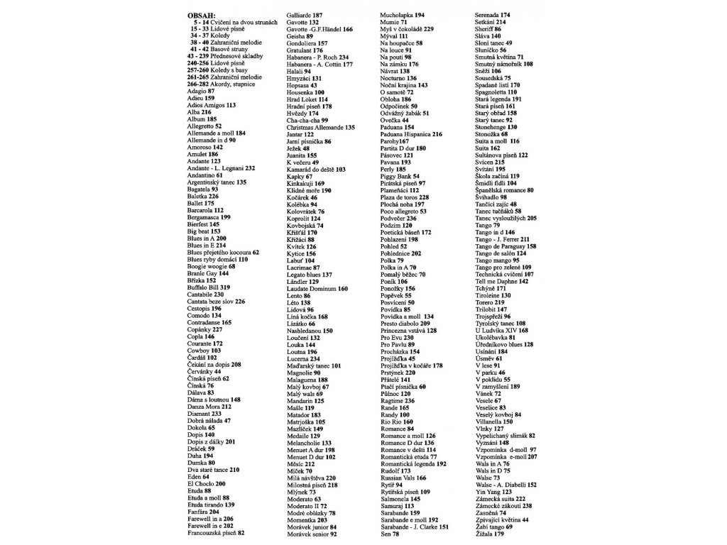 - Technicky náročnější skladby jsou zde uvedeny bez komplikovaných akordických spojů a hmatů, aby i hra v polohách nabízela dostatek prostoru k orientaci na hmatníku.