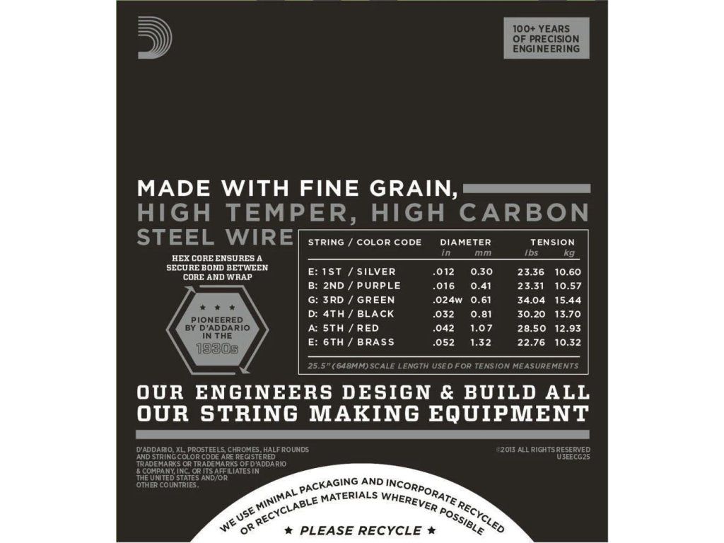 Model ECG25 s tloušťkou 12–52 (Light) poskytuje mírně vyšší tah než extra lehké sady, což přispívá k plnějšímu zvuku a lepší dynamice při hře.