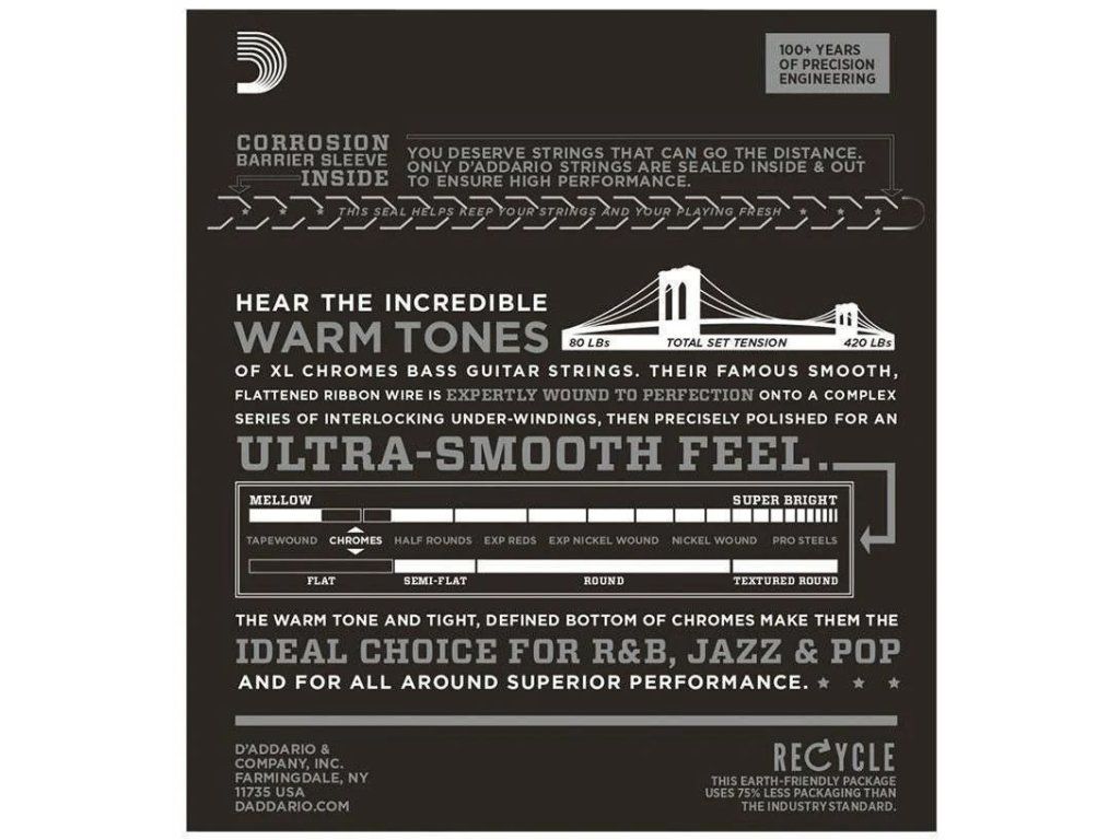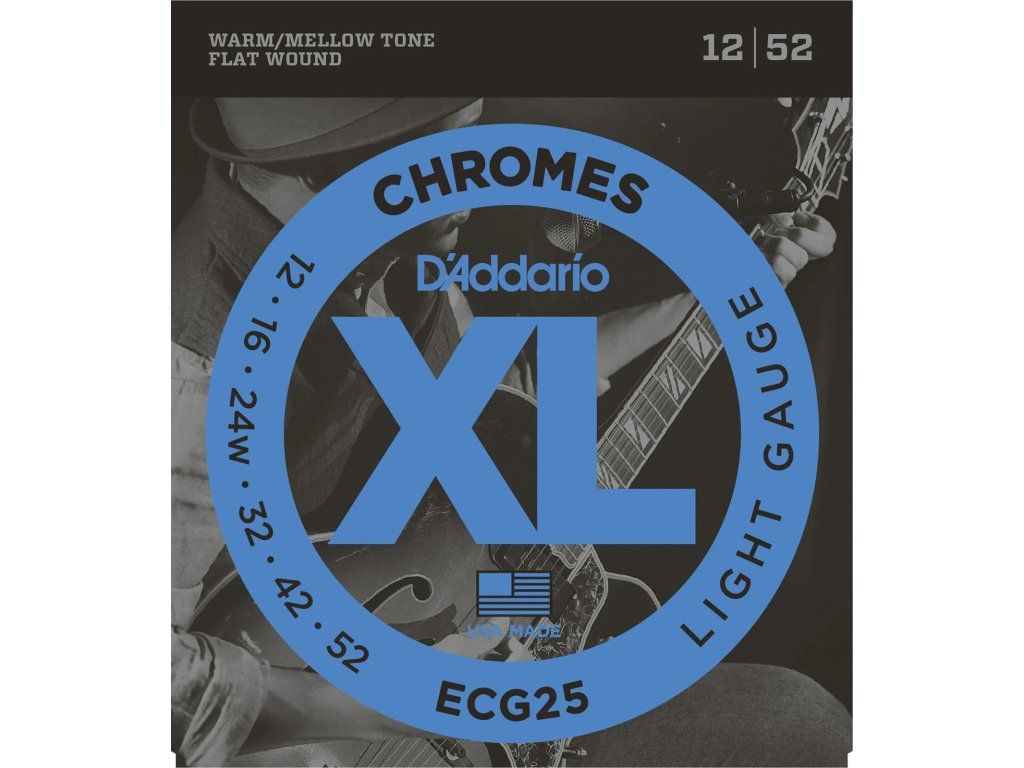 Struny D'Addario ECG25 XL Chromes Flat Wound 12-52 patří mezi nejpopulárnější flatwound struny pro elektrickou kytaru. Nabízejí teplý, kulatý a sametový tón, mimořádně hladký povrch a minimální hluk při pohybu prstů po hmatníku. Díky tomu jsou ideální zejména pro jazz, blues nebo vintage kytarový zvuk.