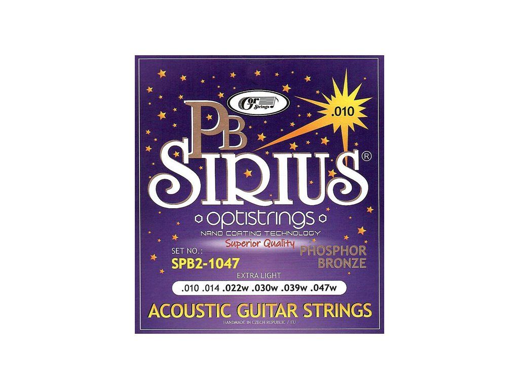 - Sirius PB SPB2-1047 jsou originální kvalitní české struny, vhodné pro amatérské i profesionální hudebníky. Základ struny tvoří hexagonální ocelové jádro. Struny jsou ovinuté oblíbenou slitinou Phosphor Bronze (PB). K výrobě strun se používá moderní technologický systém automatického tlakového ovíjení. Díky tomu struny dosahují vyšší životnosti a kvalitnějšího zvuku.