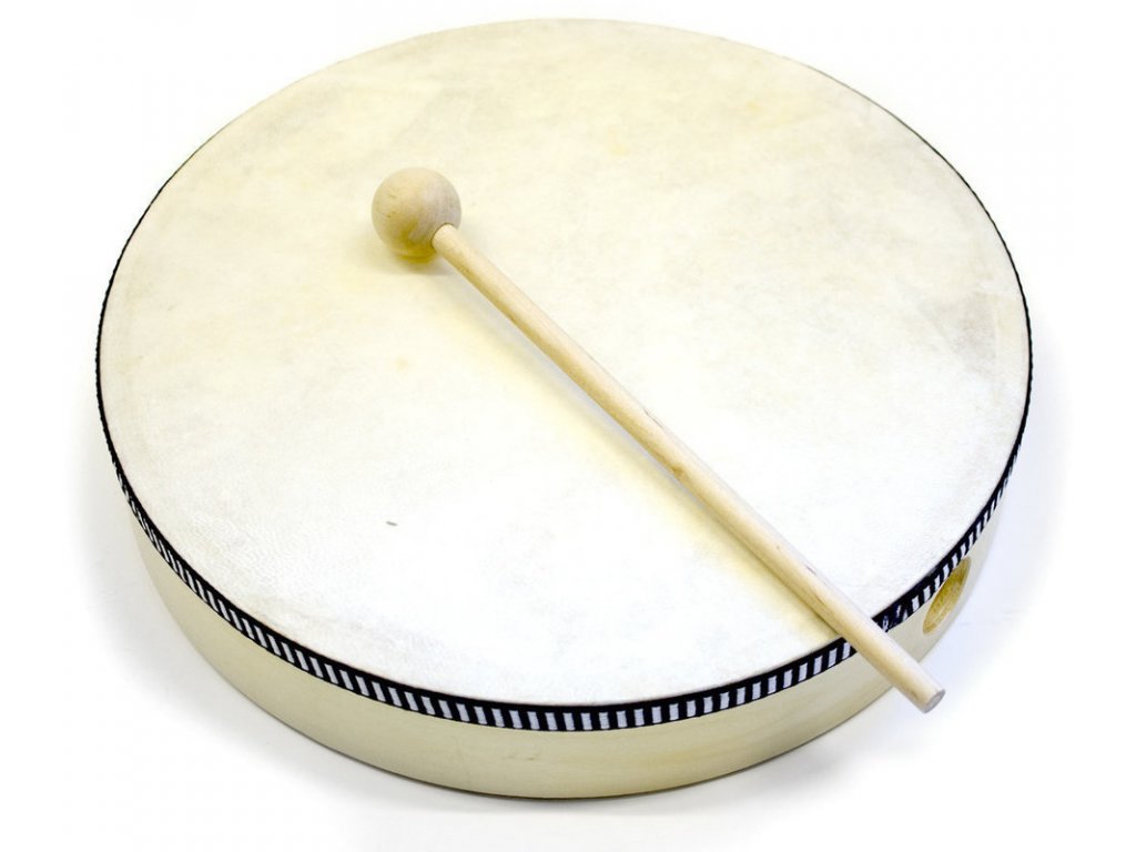 Ruční bubínek s blánou z kůže, rámem a paličkou ze dřeva. Velikost: 6 ".