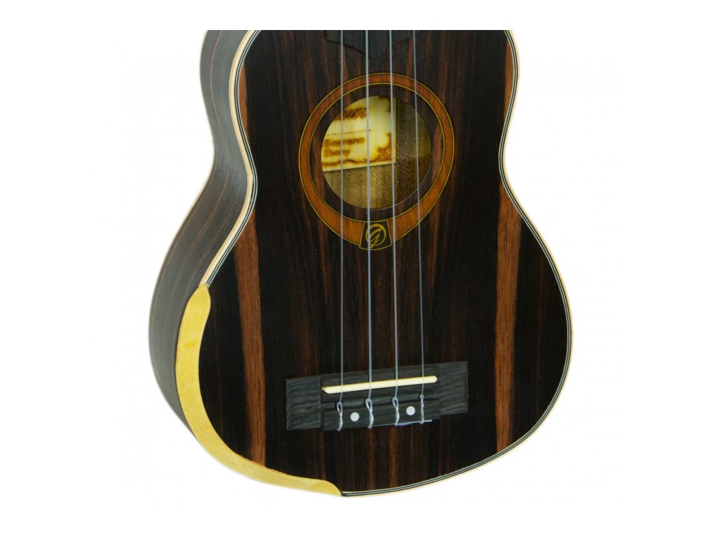 Sopránové ukulele s přední deskou, luby a zadní klenutou deskou vyrobenou z mahagonu v matném provedení open pore v povrchové úpravě ebony, krkem z okoumé a palisandrovým hmatníkem. Nástroj je osazen chromovanou kytarovou mechanikou a velmi příjemně se drží mimo jiné také díky speciální úpravě arm rest tedy zkosenou hranou. Pro hráče, kteří preferují hraní s popruhem je dispozici 2x strapholder. Nástroj má výjimečné zvukové vlastnosti a potěší jistě i svojí cenou.